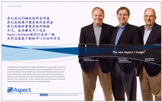 我們可以看到全新的Aspect Software將會給我們的客戶、合作伙伴以及我們的員工帶來更大的利益,我們擁有廣泛的解決方案、強大的研發(fā)團隊以及支持隊伍,Aspect將會緊密地與您合作,在發(fā)展和實施呼叫中心解決方案的同時持續(xù)給您的業(yè)務(wù)帶來新的價值。