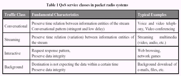 3G無(wú)線傳輸堆棧通常由二種不同類(lèi)型的輸送介質(zhì)組成,專(zhuān)用和共享信道。然而,使用專(zhuān)用信道用戶(hù)可以獲得固定帶寬用于傳輸數(shù)據(jù),但使用共享信道用戶(hù)只有在動(dòng)態(tài)的帶寬下傳輸數(shù)據(jù),類(lèi)似于ATM或GSM GPRS。HSDPA將會(huì)成為共享信道在空中的一個(gè)擴(kuò)展。除了MMS,在3G系統(tǒng)的初始階段所有的流媒體和會(huì)話應(yīng)用都希望使用專(zhuān)用信道。 在現(xiàn)代的系統(tǒng)設(shè)計(jì)中,一個(gè)應(yīng)用可以請(qǐng)求許多不同的服務(wù)質(zhì)量(QoS)級(jí)別的其中之一。服務(wù)質(zhì)量級(jí)別包含最大誤碼率、最大延遲和最大保證的帶寬等參數(shù)。此外,通常根據(jù)不同的應(yīng)用分為不同的服務(wù)級(jí)別:會(huì)話應(yīng)用、流媒體應(yīng)用、交互應(yīng)用以及后臺(tái)通信應(yīng)用。特性和典型的例子見(jiàn)表1。
