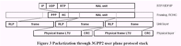 因?yàn)榘粨Q服務(wù),3GPP/3GPP2同意了一個(gè)基于IP的協(xié)議棧。圖3展示了一個(gè)NAL單元通過(guò)3GPP2用戶(hù)平面協(xié)議堆棧被封裝在RTP/UDP/IP的典型過(guò)程。在頭壓縮(RoHC)后,此IP/UDP/RTP包被封裝進(jìn)一個(gè)PDCP/PPP2包,變成了頻率鏈路控制(RLC)和服務(wù)數(shù)據(jù)單元(SDU)。RLC協(xié)議可以在三種模式下工作:透明、非確認(rèn)和確認(rèn)模式。RLC協(xié)議為用戶(hù)和數(shù)據(jù)提供分段和重傳服務(wù)。在透明和非確認(rèn)模式,RLC被定義為單向的;在確認(rèn)模式,RLC被定義為雙向的。對(duì)於所有的RLC模式,循環(huán)冗余檢查(CRC)的錯(cuò)誤檢測(cè)在物理層上被運(yùn)行,而且CRC檢查的結(jié)果和真實(shí)的數(shù)據(jù)一起被遞送到 RLC。在透明模式中,沒(méi)有上層的協(xié)議被增加到較高層的數(shù)據(jù)中。錯(cuò)誤的協(xié)議數(shù)據(jù)單元(PDUs)可以被丟棄或標(biāo)記為錯(cuò)誤。在非確認(rèn)模式中,沒(méi)有重傳協(xié)議在使用中,而且數(shù)據(jù)傳送沒(méi)有保證。接受到的錯(cuò)誤數(shù)據(jù)根據(jù)配置來(lái)決定丟棄或標(biāo)記為錯(cuò)誤。在確認(rèn)模式中,一種自動(dòng)的重復(fù)請(qǐng)求機(jī)制被用于錯(cuò)誤訂正。