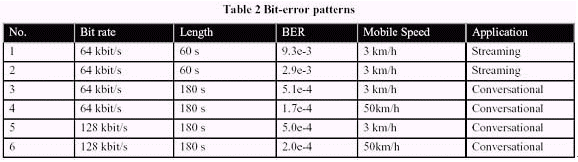 在H.264/AVC的標(biāo)準(zhǔn)化進(jìn)程中,移動(dòng)視頻傳輸?shù)闹匾砸呀?jīng)在3G移動(dòng)傳輸里面通過(guò)對(duì)基于H.324M的電路交換會(huì)話服務(wù)、包交換會(huì)話和流服務(wù)得到了證實(shí)。這些測(cè)試情況允許適當(dāng)?shù)木幋a特征、測(cè)試和容錯(cuò)仿真等特征的選擇,同時(shí)也可以得到有意義的測(cè)試結(jié)果。在本文,我們將會(huì)把重心集中在基于IP的測(cè)試情況。在正常的測(cè)試情況下,我們會(huì)定義6個(gè)測(cè)試情形組合,主要測(cè)試通過(guò)3G移動(dòng)網(wǎng)絡(luò)的包交換會(huì)話服務(wù)和包交換流媒體服務(wù)。另外,測(cè)試環(huán)境包括簡(jiǎn)單的脫機(jī)3GPP/3GPP2仿真軟件、程序接口和評(píng)估標(biāo)準(zhǔn)。無(wú)線信道使用專(zhuān)門(mén)生產(chǎn)用于移動(dòng)無(wú)線信道仿真的位率差錯(cuò)模板來(lái)進(jìn)行仿真。 位率差錯(cuò)模板在物理層上和RLC/RLP層下來(lái)捕獲,因此,它們?cè)趯?shí)驗(yàn)被用于物理層仿真。通過(guò)位率差錯(cuò)模板實(shí)驗(yàn)中得出的碼率、長(zhǎng)度、位錯(cuò)誤率和移動(dòng)速度數(shù)據(jù)詳見(jiàn)下表2。