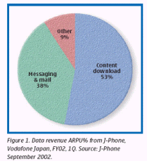 2002年第一季度,短信服務(wù)ARPU值占所有數(shù)據(jù)服務(wù)收入的19.1%,郵件服務(wù)占38%,而內(nèi)容下載服務(wù)則達到了53%。(信息來源:2002年9月J-Phone)