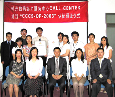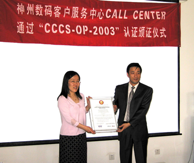 2005年6月2日,神州數(shù)碼呼叫中心通過了《全國呼叫中心運營績效標準》(CCCS-OP-2003)認證,并獲得由中國信息化推進聯(lián)盟客戶關系管理專業(yè)委員會頒發(fā)的認證證書(四星級客戶服務中心),成為國內IT行業(yè)首家通過此認證的呼叫中心。