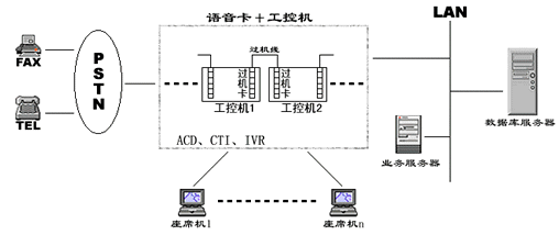在一些小型CALL CENTER系統(tǒng)中,人們通常通過語音板卡加工控機的方式搭建系統(tǒng),通常一臺設(shè)備就集成了ACD、IVR、CTI等各種資源,各資源的使用、調(diào)派通過軟件進行控制,有效的解決了建設(shè)成本高、系統(tǒng)構(gòu)造繁復(fù)的問題,具有相當(dāng)?shù)撵`活性。然而由于工控機和語音板卡容量有限,同時其標準最多只能是工業(yè)級標準,因此在構(gòu)建相對大型的呼叫中心時就總是捉襟見肘。為了增加系統(tǒng)容量,解決多臺PC之間進行通道交換的難題,人們又設(shè)計了過機卡和過機線來解決,其應(yīng)用系統(tǒng)如下圖: