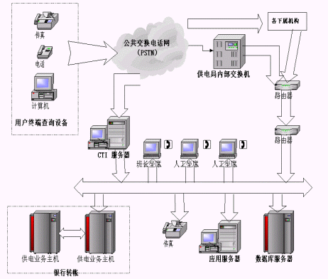 (3)自動(dòng)轉(zhuǎn)人工服務(wù)。系統(tǒng)還可自動(dòng)轉(zhuǎn)接人工坐席,由電力專(zhuān)業(yè)人員負(fù)責(zé)解答和處理客戶意見(jiàn);蛘邔⒖蛻舴⻊(wù)中心系統(tǒng)與后臺(tái)數(shù)據(jù)庫(kù)服務(wù)器相接,通過(guò)客戶提供的相關(guān)信息,為客戶提供個(gè)性化的在線服務(wù)。