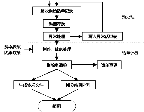 區(qū)域計(jì)費(fèi)中心從交換機(jī)實(shí)時(shí)/定時(shí)采集原始話單數(shù)據(jù),它是整個系統(tǒng)的起始點(diǎn),也是系統(tǒng)其它部分的基礎(chǔ)。其性能直接影響整個系統(tǒng)的運(yùn)行效果。對該模塊要求穩(wěn)定可靠、處理靈活。 “八國九制”意味著,一個好的計(jì)費(fèi)采集系統(tǒng),必然要求它能夠處理多種交換機(jī)格式。比如EWSD、S1240、5ESS等等。 在采集所用網(wǎng)絡(luò)傳輸協(xié)議上,一般要求系統(tǒng)支持X.25/FTAM、X.25/CMIP等協(xié)議。 2.計(jì)費(fèi)結(jié)算 采集機(jī)從交換機(jī)上采集下來原始話單文件,該類文件是BCD碼文件,需要進(jìn)行碼型轉(zhuǎn)換,變成ASCII碼文件,為后續(xù)的計(jì)費(fèi)處理創(chuàng)造條件。 話單格式轉(zhuǎn)換:話單格式轉(zhuǎn)換從交換機(jī)下載的二進(jìn)制信息中提取用于計(jì)費(fèi)和統(tǒng)計(jì)的信息,并從二進(jìn)制格式轉(zhuǎn)換為文本格式。但是由于上面提到的原因,國內(nèi)交換機(jī)種類比較多,各種交換機(jī)的數(shù)據(jù)格式都不相同,即使是相同的交換機(jī),由于需要版本升級,也會對數(shù)據(jù)格式產(chǎn)生影響。假如預(yù)處理模塊不能靈活地處理各種格式的文件,則勢必會對電信服務(wù)商的投資造成浪費(fèi)。國創(chuàng)公司在話單預(yù)處理中,提供了一種“自定義話單格式”方式,用戶可以根據(jù)自己交換機(jī)的數(shù)據(jù)格式進(jìn)行配置,而預(yù)處理模塊不需進(jìn)行修改。即可以適應(yīng)當(dāng)前多種交換機(jī)并存的局面,又可以適應(yīng)未來交換機(jī)版本升級的需求,極大地保護(hù)了用戶的投資。 計(jì)費(fèi)劃價(jià)處理: 計(jì)費(fèi)計(jì)算模塊根據(jù)話單中記錄的起始時(shí)間、通話時(shí)長、對端號碼等信息在資費(fèi)策略庫中查找滿足條件的費(fèi)率極其優(yōu)惠策略。從而計(jì)算出此次通話應(yīng)向用戶收取的基本費(fèi)用。特別地,考慮到業(yè)務(wù)的發(fā)展與變化,系統(tǒng)可對費(fèi)用中的各項(xiàng)子費(fèi)用單獨(dú)計(jì)算,并能夠適應(yīng)新的優(yōu)惠策略的增加。整個計(jì)費(fèi)流程如下:
