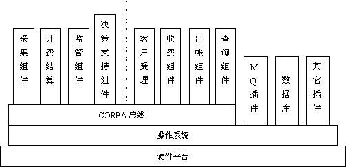 長途電話聯(lián)機(jī)計(jì)費(fèi)系統(tǒng) 長話計(jì)費(fèi)系統(tǒng)既包括計(jì)費(fèi)結(jié)算系統(tǒng),又包括營業(yè)服務(wù)系統(tǒng),功能比較多,數(shù)據(jù)處理流程也相對復(fù)雜。 簡單的傳統(tǒng)數(shù)據(jù)庫的機(jī)械化編程已很難滿足系統(tǒng)對大數(shù)據(jù)量的處理及靈活性等方面的要求,因此在這套系統(tǒng)中,我們采用了一些當(dāng)今業(yè)界的熱門技術(shù)。比如采用了CORBA軟總線思想和MQ Series消息管理隊(duì)列,也使之成為聯(lián)機(jī)計(jì)費(fèi)系統(tǒng)平臺的一次成功實(shí)施。其系統(tǒng)層次結(jié)構(gòu)圖如下: