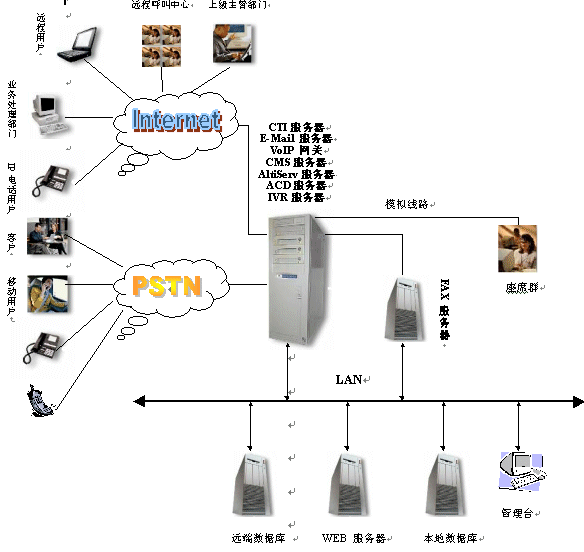 另一方面,CTI(計算機語音集成)技術的出現(xiàn),實現(xiàn)了通信技術與計算機技術的結合,利用計算機技術可以大大增加服務的信息量、提高速度、拓展新型客戶服務業(yè)務。因此為了滿足計算機、信息技術的演進和客戶服務的需求,利用CTI技術,面向用戶,提供綜合服務的客戶服務中心系統(tǒng)應運而生。對于用戶,客戶服務中心系統(tǒng)能夠提供更優(yōu)質的用戶服務,用戶能從服務方得到最快的響應,能夠得到24小時的持續(xù)服務,能夠同時得到語音、圖象、數(shù)據(jù)多方面的信息支持。對于企業(yè),客戶服務中心在提高客戶服務質量的同時,還能有效的控制成本、增加收入,樹立專業(yè)化的企業(yè)形象,建立完善的客戶服務資料庫。