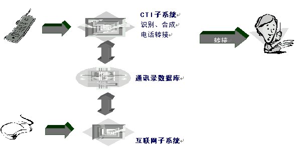 Internet子模塊相對比較簡單,可以采用目前主流的網(wǎng)絡通訊錄服務方式進行服務;而為了更好服務用戶,CTI子模塊需要采用先進的語音合成和語音識別技術。