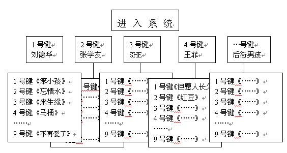 眾所周知,目前大多數(shù)電話機和手機的操作鍵盤都只有0-9十個數(shù)字鍵和*號和#號兩個符號鍵,因此在設(shè)計導(dǎo)航菜單的時候很受限制。比如在點歌節(jié)目中,用這些數(shù)字鍵來指代上千首歌曲是根本不可能的。以前多采用的方法有兩種:一是預(yù)先給用戶發(fā)送歌曲手冊,上面可以查到每首歌曲的代號。這種方式的缺點是實時性差,不能隨時更新歌曲庫。另外印刷宣傳資料帶來的人力和成本也不容忽視;另一種方法是將歌曲根據(jù)歌手、主題進行分類,比如下圖所列的結(jié)構(gòu):