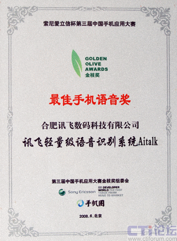 2008年6月26日,代表了中國(guó)手機(jī)應(yīng)用最高水平、最新發(fā)展的索尼愛立信杯第三屆中國(guó)手機(jī)應(yīng)用大賽金枝獎(jiǎng)?lì)C獎(jiǎng)典禮在北京隆重舉行,科大訊飛全資子公司——訊飛數(shù)碼提交的參賽產(chǎn)品,輕量級(jí)語音識(shí)別系統(tǒng)Aitalk,榮獲本屆大賽 “最佳手機(jī)語音金枝獎(jiǎng)”。這是科大訊飛既在本賽事首屆、第二屆獲此殊榮后,連續(xù)第三年奪得該獎(jiǎng)項(xiàng),充分體現(xiàn)了科大訊飛在手機(jī)語音應(yīng)用領(lǐng)域具備的超群實(shí)力和絕對(duì)的領(lǐng)先地位。