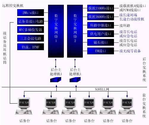 "前臺(tái)座席系統(tǒng)"包括班長(zhǎng)臺(tái)和話(huà)務(wù)臺(tái),均采用微機(jī),運(yùn)用先進(jìn)的計(jì)算機(jī)聯(lián)網(wǎng)技術(shù),將它們通過(guò)網(wǎng)絡(luò)與"后臺(tái)交換系統(tǒng)"相連。班長(zhǎng)臺(tái)和所有話(huà)務(wù)臺(tái)的硬件連接完全相同,任何一臺(tái)損壞,不影響其它話(huà)務(wù)臺(tái)的使用,即不存在關(guān)鍵接點(diǎn),提高了系統(tǒng)的安全可靠性。全漢化圖形界面,交互式人機(jī)操作方式,簡(jiǎn)單明了,易于掌握。所有話(huà)務(wù)臺(tái)均為集記錄、查號(hào)、市話(huà)轉(zhuǎn)接、長(zhǎng)話(huà)轉(zhuǎn)接為一體的綜合型人工話(huà)務(wù)臺(tái),所有功能由數(shù)據(jù)定義,可分可合,可方便的進(jìn)行設(shè)置,也可臨時(shí)并席,為系統(tǒng)高質(zhì)量的服務(wù)提供了可靠的基礎(chǔ)。所有話(huà)票均在計(jì)算機(jī)上填寫(xiě),由網(wǎng)絡(luò)自動(dòng)傳送,不再使用紙?jiān)捚,也不需人工分發(fā)話(huà)票,極大的減輕了勞動(dòng)強(qiáng)度,提高了辦事效率。為了減小系統(tǒng)規(guī)模,我們將查詢(xún)、計(jì)費(fèi)、統(tǒng)計(jì)、管理、維護(hù)五種功能融合為一體,統(tǒng)一成為多功能的班長(zhǎng)臺(tái),其功能亦可分可合,視用戶(hù)需求而定。