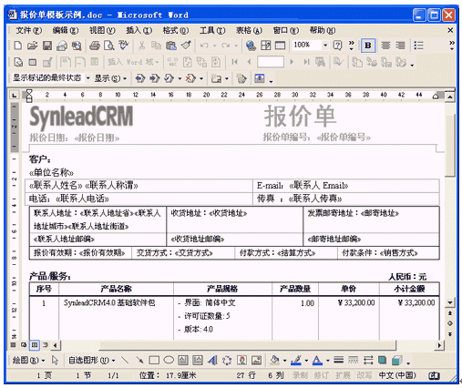 SynleadCRM企業(yè)版4.0很好地滿足了銷售自動化管理、服務(wù)自動化管理的上述需求,提供了開放的客戶化Word模板,使得用戶企業(yè)能夠根據(jù)實際情況不斷擴(kuò)展該應(yīng)用?蛻艋0逯苯釉赪ord中編輯,可直觀、方便地插入合并域字段或代碼,只要對Word稍加了解就可勝任模板維護(hù)工作。