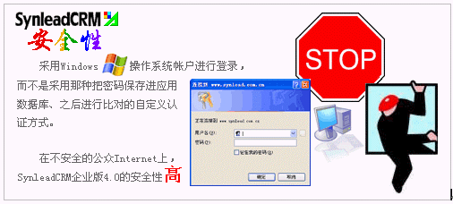 SynleadCRM企業(yè)版4.0采用了高度捆扎操作系統(tǒng)安全性的域帳戶認(rèn)證,而不是在應(yīng)用層面自定義用戶認(rèn)證策略。事實上,SynleadCRM從一開始就基于這種安全機制并且不斷完善,以避免今后無法向更高端邁進(jìn)。