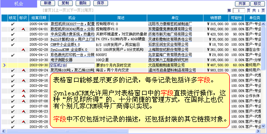 上圖"機會管理"表格窗口進一步對人本化的管理方法進行了舉例。在這里,您可直接對瀏覽到的字段進行交互(是否能夠新建、修改、刪除,受管理授權或默認授權約束),而不必一定要轉(zhuǎn)到另外的窗口才可操作字段。該方法在SynleadCRM中處處存在,它不僅僅為了提高工作效率,更讓企業(yè)在推行CRM管理變革時襯托出靈活性,而不是帶來了僵化。