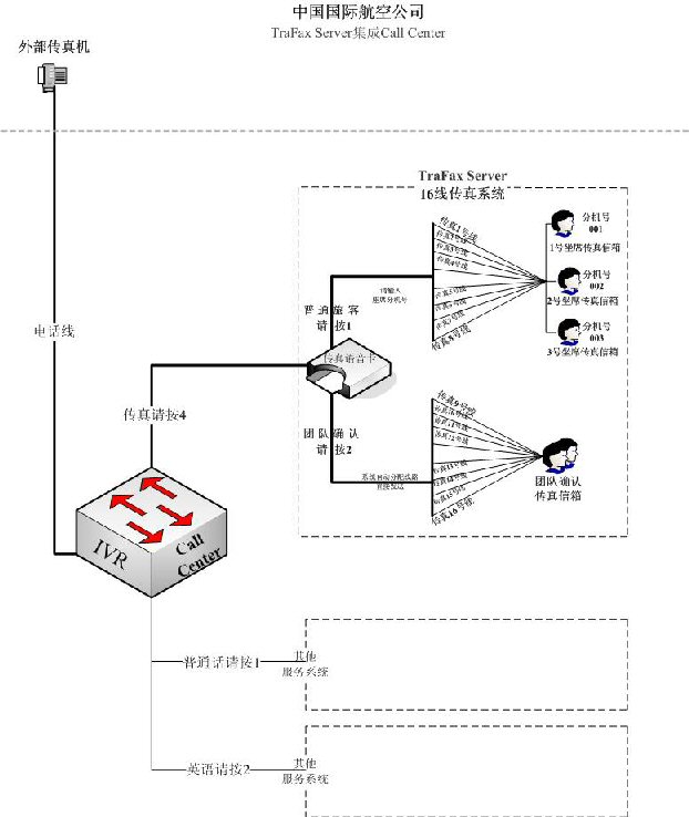 與國(guó)航Call Center集成后的TraFax Server系統(tǒng)共有16條傳真線路,其中一半專門用作接收普通旅客發(fā)來(lái)的傳真,另外8條線路則是為受理團(tuán)體客戶的傳真確認(rèn)而設(shè)。二者不同是,普通客戶在向國(guó)航發(fā)送傳真的過(guò)程中需要根據(jù)系統(tǒng)提示音在發(fā)送前的最后環(huán)節(jié)中輸入明確的坐席分機(jī)號(hào)碼,以使傳真文件發(fā)向分機(jī)號(hào)對(duì)用的坐席傳真信箱中,以此實(shí)現(xiàn)坐席人員對(duì)旅客的一對(duì)一式服務(wù),從而提高服務(wù)水平。而團(tuán)隊(duì)確認(rèn)的傳真無(wú)需輸入坐席分機(jī)號(hào),傳真將被空閑的線路直接發(fā)送到一個(gè)專門的團(tuán)隊(duì)確認(rèn)傳真信箱中,從而確保國(guó)航對(duì)該類傳真的快速處理能力。目前,16線的TraFax
