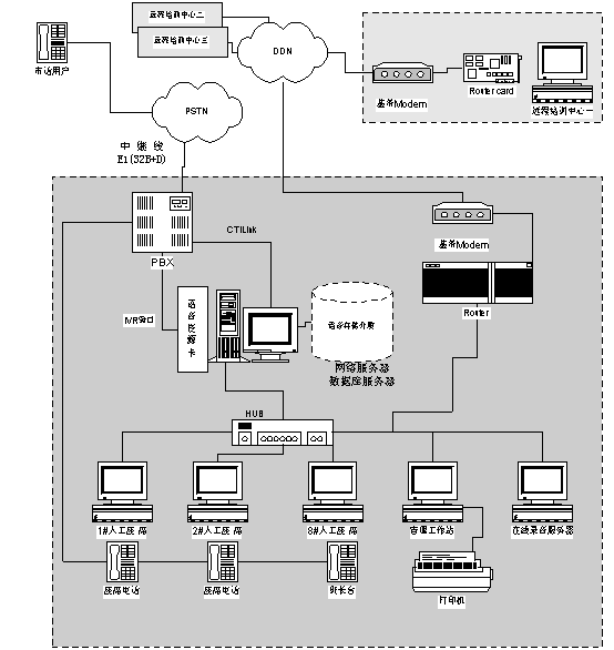 北京強(qiáng)訊恒通網(wǎng)絡(luò)技術(shù)公司通過利用該學(xué)院現(xiàn)有的計(jì)算機(jī)局域網(wǎng),根據(jù)該學(xué)院業(yè)務(wù)需求專門為800服務(wù)熱線設(shè)立了一組服務(wù)座席,每個座席都有座席電腦。所有撥打800熱線的電話通過CTI服務(wù)器的ACD系統(tǒng)分配到服務(wù)組最適合的座席。如該服務(wù)組暫時(shí)沒有空閑座席,則語音提示用戶等待并播放音樂,一旦有座席空閑則自動將該用戶電話轉(zhuǎn)接到空閑座席。當(dāng)有外線進(jìn)來接通到某個座席時(shí),系統(tǒng)自動彈出該電話用戶的客戶資料。