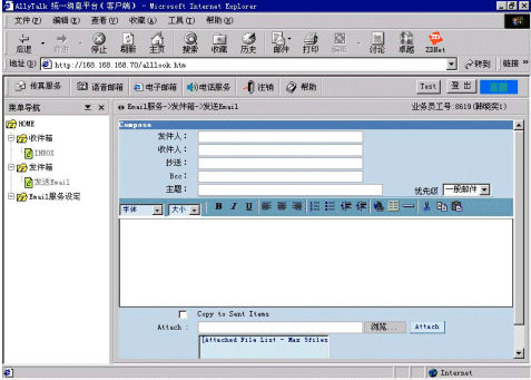 AllyTalk統(tǒng)一消息的電子郵箱具有與Microsoft Exchange或OutLook相同的功能,可以通過設(shè)定Email服務(wù)的參數(shù),實現(xiàn)公司內(nèi)部收發(fā)Email,或通過Email服務(wù)器實現(xiàn)與Internet的通信;
