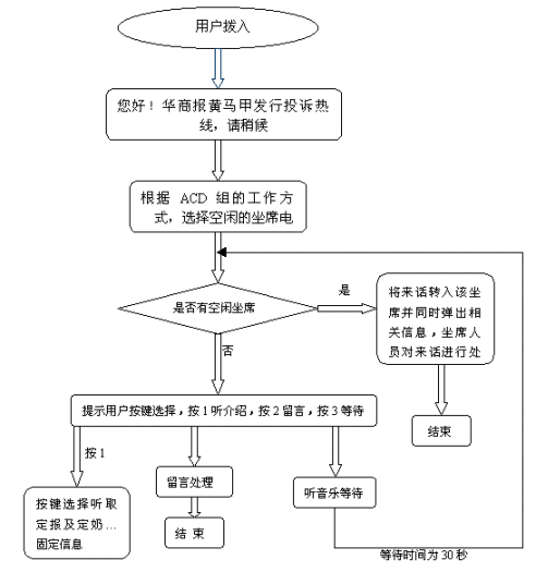 當(dāng)坐席全忙時,IVR流程會引導(dǎo)用戶按鍵選擇聽取介紹、留言及聽音樂等待,用戶可按鍵選擇聽取介紹(包括定報及定奶的信息),聽完介紹用戶可按鍵選擇繼續(xù)聽介紹或轉(zhuǎn)人工服務(wù);用戶選擇留言時,IVR流程會提示用戶留下電話及投訴內(nèi)容,有指定的坐席人員每天聽取留言并進行處理,從而減少了由于話務(wù)量集中而坐席人員無法及時處理的投訴電話。用戶選擇等待時會聽到一段優(yōu)美的音樂,當(dāng)坐席有空閑時電話會被及時的轉(zhuǎn)入坐席由坐席人員進行處理。