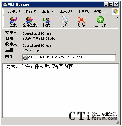 A、電子郵件檢索:語音留言可以以Email方式,發(fā)送到信箱主人的郵箱中,用戶可以使用Outlook、Foxmail或其它郵件方式,以附件方式收取個人的語音留言,通過PC上的揚(yáng)聲器、耳機(jī)來收聽消息。