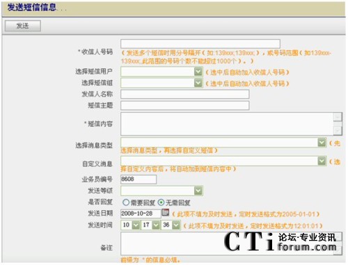 - 群發(fā)短信:通過個人的Web方式的客戶端給系統(tǒng)預(yù)先設(shè)置好的用戶組或?qū)懭攵鄠對方手機(jī)號碼發(fā)送短信;