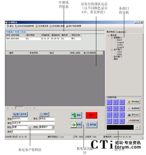 話務(wù)員可以通過點擊鼠標(biāo)進(jìn)行呼叫、應(yīng)答、轉(zhuǎn)接、掛機(jī)、強(qiáng)拆、強(qiáng)插等操作。