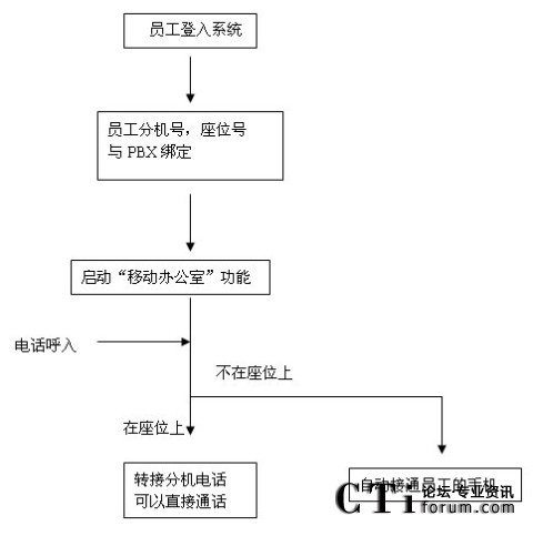 每個需要到企業(yè)辦公的員工,可以通過門禁系統(tǒng),或?qū)iT一臺PC上進(jìn)行登入,通過后由系統(tǒng)自動分配或員工選擇一個空閑的座位,座位號與員工的分機(jī)號碼綁定,所有對這個員工分機(jī)的呼叫均被自動轉(zhuǎn)移到其座位上的辦公電話上;