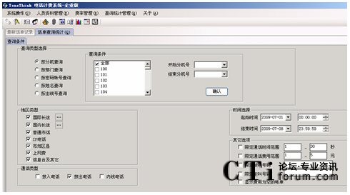 系統(tǒng)提供多種查詢條件,進(jìn)行話單明細(xì)和話單結(jié)算的統(tǒng)計,如:按分機(jī)、部門、密碼、職員名稱、出現(xiàn)號碼、通話時間范圍、通話費(fèi)用范圍、制定主叫、制定被叫、不同的通話類型(國內(nèi)長途、國際長途、市話、IP等)。