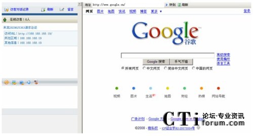 在客服人員與網(wǎng)站訪客聊天的過(guò)程中,可以通過(guò)“網(wǎng)頁(yè)同步”,使網(wǎng)站訪客的電腦上自動(dòng)彈出與客服人員同樣的網(wǎng)頁(yè)(如下圖:網(wǎng)站訪客的電腦上自動(dòng)彈出www.google.com的網(wǎng)站)。