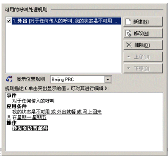 用戶可以很方便地設置自己的來電處理規(guī)則 ,如:設置外出時,所有來電轉到語音郵箱。