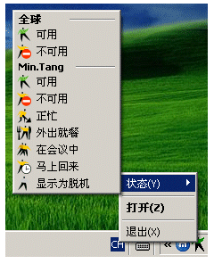 用戶可以點擊“設置狀態(tài)”工具欄的上圖標或是點擊右下角“系統(tǒng)托盤”中的圖標來設置自己的工作狀態(tài)。