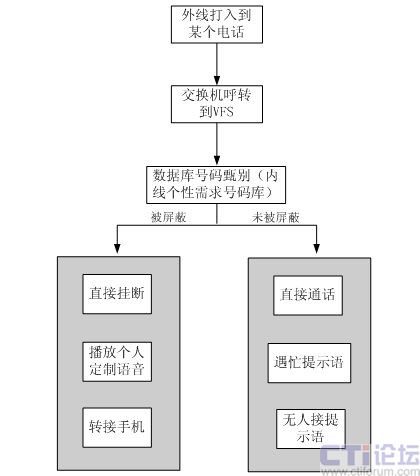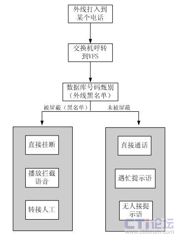 基本技術(shù)特點(diǎn)    外線(主叫)撥打某一電話(被叫),在經(jīng)過VFS系統(tǒng)數(shù)據(jù)庫甄別后,如果該外線(主叫)存在于主叫屏蔽號碼段的黑名單數(shù)據(jù)庫中,該外線(主叫)將會被系統(tǒng)自動屏蔽。如被屏蔽,則根據(jù)流程動作,可以播放提示音、轉(zhuǎn)接人工或者直接掛斷。