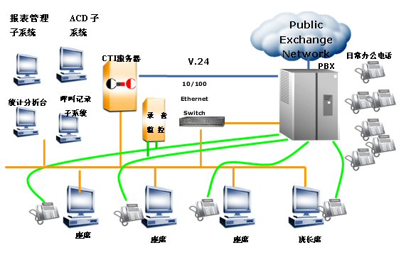 負責整個呼叫中心與交換機的通信和呼叫中心的管理。商路通的CTI LINK中間件可以實現(xiàn),當一個呼叫進來時,可同時在多個ACD隊列上排隊,一旦有空閑座席時,立即將呼叫接到座席。可實時監(jiān)控每個ACD隊列的狀態(tài),如:已登錄的座席數、空閑座席數、排隊等待的呼叫個數。