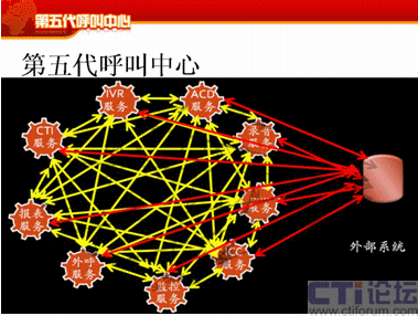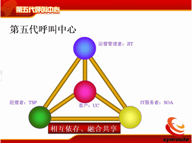 這幾方面相互制約,相互影響,相互關(guān)聯(lián),這是我們提的相互依存,融合共享,這是它的核心,這幾個方面相互作用。今天短暫的時間也只能講到IT服務(wù)者通過SOA在第五代呼叫中心如何支持其它方面的要求。