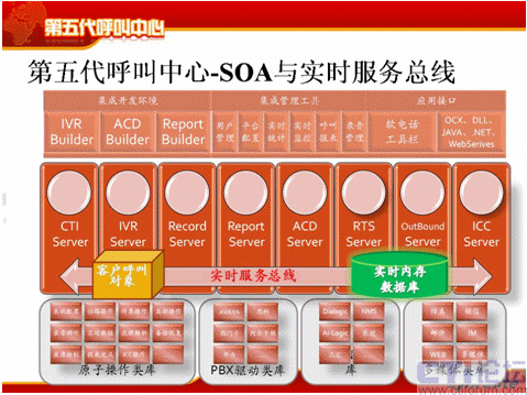 IBM、微軟、BEA、朗訊、AVAYA、甲骨文等等都開始去支持SOA,SOA被公認為解決當前解決軟件聚合的有效方式,其中一個重要的概念就是ESB,再強調(diào)一下ESB是企業(yè)服務(wù)總線。僅有SOA是不夠的,因為ESB它的典型特征是面向WEB非實時的系統(tǒng),這個非實時的系統(tǒng),呼叫中心的實時要求太高了,一個電話來了以后,做屏幕彈出的時候,你需要一秒鐘之內(nèi)屏幕彈出來;如果非實時的,就要五秒、十秒,這個是接受不了,接著說現(xiàn)場管理和座席的自我管理也是不允許的,現(xiàn)在要實時看到座席的占有率,看到排隊情況,看呼損這些指標,可是光單純地用ESB是解決不了,所以我們就提出了實時服務(wù)總線。