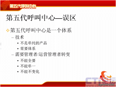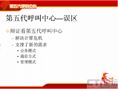 下面我提第五代呼叫中心的誤區(qū),首先我們要辯證地看第五代呼叫中心,剛才好像我在解決問題,這個呼叫中心的計算危機產(chǎn)生了,我在解決計算危機的問題,但是大家要反著想,我把這個問題解決了,我按這種方式去架構(gòu)了,這時候它的業(yè)務(wù)模式就能支持到非常豐富了,而以前的業(yè)務(wù)模式,業(yè)務(wù)的創(chuàng)造為什么進行不下去?我們不能說全部都是因為IT系統(tǒng),但是IT系統(tǒng)占很大的一個部分,其實就是因為投資的部分,如果你有足夠錢的話,可以實現(xiàn)足夠的想法。第二個方面通信方式也是一樣,通信方式也是你可以支持更多的通信方式,你可以將3G的視頻加上去,你可以將很多業(yè)務(wù)加進去,你可以把固定點報警加上去,你可以把IPTV的業(yè)務(wù)方式加上去,管理模式也一樣,你可以不斷地調(diào)整,這個調(diào)整只要是在框架一定范圍內(nèi)不斷地調(diào)整都可以支持,那么對于運營管理也能同樣進行有效的支持。