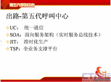 迎接第五代呼叫中心的挑戰(zhàn),重申一下,第五代呼叫中心的四個特性:UC統(tǒng)一通信的;SOA面向服務(wù)架構(gòu)和實時服務(wù)總線技術(shù);JIT的準時化生產(chǎn);TSP全業(yè)務(wù)平臺。