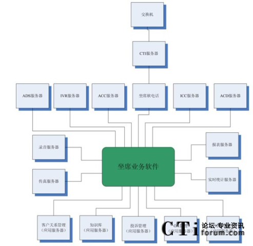 很多集成商或業(yè)務(wù)軟件開(kāi)發(fā)商認(rèn)為這種結(jié)構(gòu)過(guò)于復(fù)雜,而他們自身往往提供“整體解決方案”,即所有的服務(wù)器軟件基本上都是自己的,根據(jù)客戶(hù)的要求修改即可。例如,客戶(hù)關(guān)系管理、知識(shí)庫(kù)、投訴管理、OA、訂單管理以及坐席軟電話、ADS服務(wù)器、IVR服務(wù)器、ACC服務(wù)器、ICC服務(wù)器、ACD服務(wù)器、錄音服務(wù)器、傳真服務(wù)器、報(bào)表服務(wù)器、實(shí)時(shí)統(tǒng)計(jì)服務(wù)器都是自己來(lái)做,那么對(duì)于很多接口環(huán)節(jié)都可以節(jié)省了。