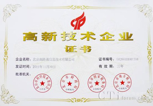 CTI論壇(ctiforum)3月23日消息(記者 浩宇):商路通再傳喜訊,2012年3月12日商路通獲得了“國家級(jí)高新技術(shù)企業(yè)”證書,(證書編號(hào):GR201111001184,有效期三年),這標(biāo)志著商路通發(fā)展的又一個(gè)新的里程碑。