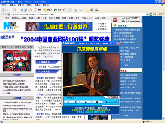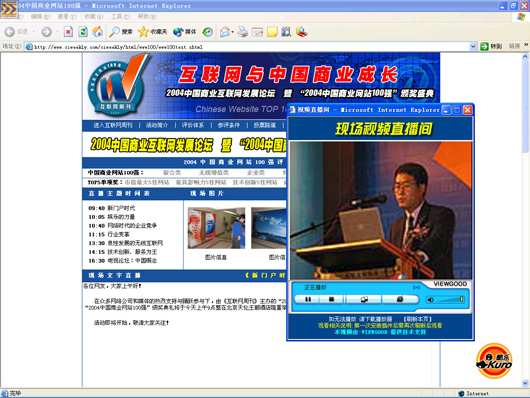 作為此次活動全程流媒體直播技術提供商VIEWGOOD(www.viewgood.com)商務主管在活動現(xiàn)場說:“中國大陸的上網(wǎng)用戶總人數(shù)即將突破1億,中外商業(yè)網(wǎng)站的資本運作空前活躍,3G、IPv6等新技術將催生互聯(lián)網(wǎng)的新一輪變革,網(wǎng)絡媒體正在從“第四媒體”快速走向“第一媒體”,致力為中國互聯(lián)網(wǎng)媒體服務的VIEWGOOD和所有的網(wǎng)站一樣,既面臨著激烈的挑戰(zhàn),更面臨著難得的發(fā)展機遇。無論是成長最快的網(wǎng)站、最具潛力的網(wǎng)站,還是創(chuàng)新最佳的網(wǎng)站,都是VIEWGOOD的合作伙伴。我們將以國際最先進的流媒體技術服務于中國互聯(lián)網(wǎng)!