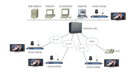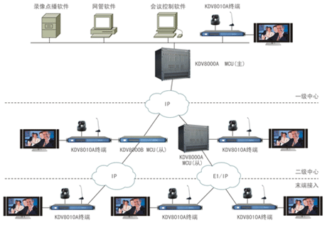 作為一款電信級MCU,KDV8000A具有強大的接入能力和豐富的功能模塊,可靈活應(yīng)用于各類視頻會議系統(tǒng)。下圖1是KDV8000A在節(jié)點數(shù)量多、網(wǎng)絡(luò)環(huán)境復(fù)雜的大型視頻會議系統(tǒng)中的典型應(yīng)用,下圖2是KDV8000A在衛(wèi)星視頻會議系統(tǒng)中的應(yīng)用,下圖3是KDV8000A在多級級聯(lián)系統(tǒng)中的應(yīng)用。