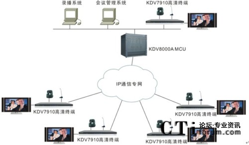 各會場配置KDV7910高清視頻終端,該終端是業(yè)內(nèi)第一款真正支持1080P的高清視頻會議終端,具有非凡的畫面質(zhì)量、音頻效果和卓越的雙流協(xié)作能力。各終端與中心點(diǎn)MCU之間通過全省財政IP通信專網(wǎng)相連。