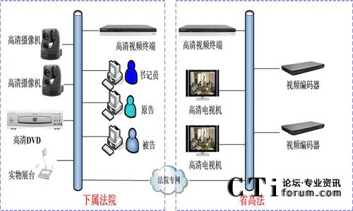 系統(tǒng)覆蓋省高院法庭、8個(gè)地市中院法庭和58個(gè)基層法庭。系統(tǒng)利用法院專用IP傳輸網(wǎng)絡(luò),以省高院各法庭為一級(jí)中心,地市中院為分控中心,基層法院為末端接入。在省高院中心、地市中院和基層分院設(shè)立遠(yuǎn)程數(shù)字庭審中心,配置庭審視頻終端、專用攝像機(jī)和麥克風(fēng),實(shí)現(xiàn)圖像傳輸和遠(yuǎn)程通信。