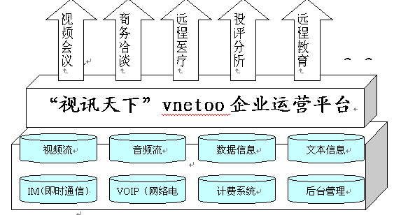 VNETOO視訊運營平臺具有強大的數(shù)據(jù)功能和優(yōu)質(zhì)的音視頻效果,是集"視頻+語音+數(shù)據(jù)+IM(即時通信)+VOIP(網(wǎng)絡(luò)電話)+計費+后臺管理"的基于IP網(wǎng)絡(luò)世界一流視訊服務(wù)提供平臺,它革命性地開創(chuàng)了視訊運營領(lǐng)域的全新模式。(見圖表一:"視訊天下"vnetoo運營平臺結(jié)構(gòu))。