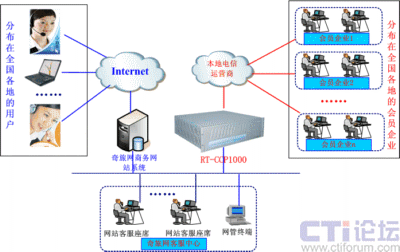 融天科技采用自主研發(fā)的融合通信平臺RT-CCP1000設備一套為奇旅網(wǎng)部署了一套Web-call聯(lián)絡中心。RT-CCP1000集傳統(tǒng)PBX、IP-PBX、CTI、IVR、DB、VOIP、錄音、傳真等服務于一體,以模塊化的形式提供用戶所需的各種功能,是一套功能強大的一體化融合通信平臺,安裝部署非常方便,維護管理非常簡單。該方案中,與本地電信運營商采用數(shù)字中繼E1接口和模擬中繼FXO接口方式連接,軟電話以控件方式嵌入到奇旅網(wǎng)公司的商務網(wǎng)站上, RT-CCP1000將接收所有以該控件方式來至Internet來的呼叫,并通過與電信運營商接口呼叫相關會員企業(yè)綁定的聯(lián)絡電話,這樣就實現(xiàn)了上網(wǎng)用戶通過電腦與會員企業(yè)免費進行直接聯(lián)絡。網(wǎng)絡拓撲圖如下: