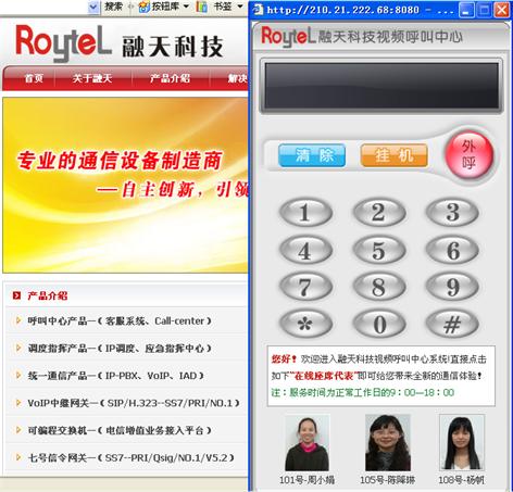 1、融天科技視頻呼叫中心Web服務(wù)界面如下(以融天科技網(wǎng)站上的“視頻呼叫中心在線體驗(yàn)”為例),軟件電話嵌入到融天科技企業(yè)網(wǎng)站上后,點(diǎn)擊企業(yè)的“在線服務(wù)”即可彈出如下軟電話服務(wù)界面: