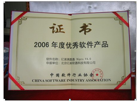 2006年1月18日,由中國(guó)軟件行業(yè)協(xié)會(huì)頒發(fā)的“2006年度推薦優(yōu)秀軟件產(chǎn)品”獎(jiǎng),經(jīng)過(guò)層層評(píng)審,終于浮出水面。北京億美軟通科技有限公司推薦的面向3G應(yīng)用的移動(dòng)商務(wù)產(chǎn)品——億美滿意通3Gpro憑借著不俗的表現(xiàn)喜獲殊榮。