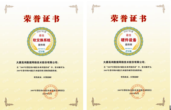 日前,由C114中國通信網(wǎng)主辦的“2007年度優(yōu)秀IP通信企業(yè)評選活動”圓滿結(jié)束。大唐高鴻數(shù)據(jù)網(wǎng)絡技術股份有限公司(以下簡稱“大唐高鴻”)憑借雄厚實力喜獲“2007年度中國IP通信行業(yè)最佳軟交換系統(tǒng)提供商”和“2007年度中國IP通信行業(yè)最佳硬件設備提供商”兩項大獎。這是大唐高鴻繼2007年4月榮獲中國VoIP論壇“2006年最佳中繼網(wǎng)關提供商”和“2006最佳VoIP解決方案提供商”兩項大獎之后的又一次實至名歸。