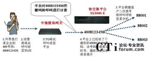 400業(yè)務又稱“主被叫分攤付費業(yè)務”,即為客戶提供一個全國范圍的400號碼,并把對該號碼的呼叫接至被叫客戶事先規(guī)定目的地(電話號碼或呼叫中心)。通常是主叫(撥打400的人)付市話費,被叫(擁有400號碼的客戶)付長途費(主叫地區(qū)到目的地之間)SS3000-E適時推出了支持400業(yè)務的功能,即“被叫計費”。按照下圖的指示,利用SS3000-E的被叫計費功能,本次通話的費用部分計在了4008123456這個號碼上。