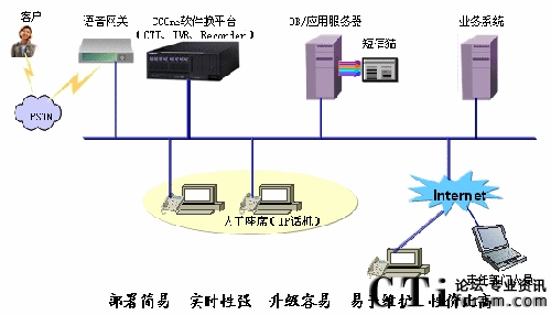 有沒有辦法讓數(shù)量占多數(shù)的中小集團客戶也能享受IP呼叫中心的好處呢?在一個日益成熟的開放市場中,答案是肯定的。目前已經(jīng)有國內(nèi)廠商針對這塊市場在進行耕耘,我們可以看看國內(nèi)在這方面走在前列的廠商大唐高鴻新推出的針對中小企業(yè)的IP呼叫中心產(chǎn)品SS3000-C。SS3000-C,采用純IP技術(shù),利用先進的軟交換技術(shù),系統(tǒng)可伸縮性極強,可隨客戶需要進行靈活建設(shè)。