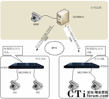 - 總部給各分公司只分配一個(gè)號碼,做為分公司的總機(jī)接入號碼,例如給分公司A分配的號碼3000。